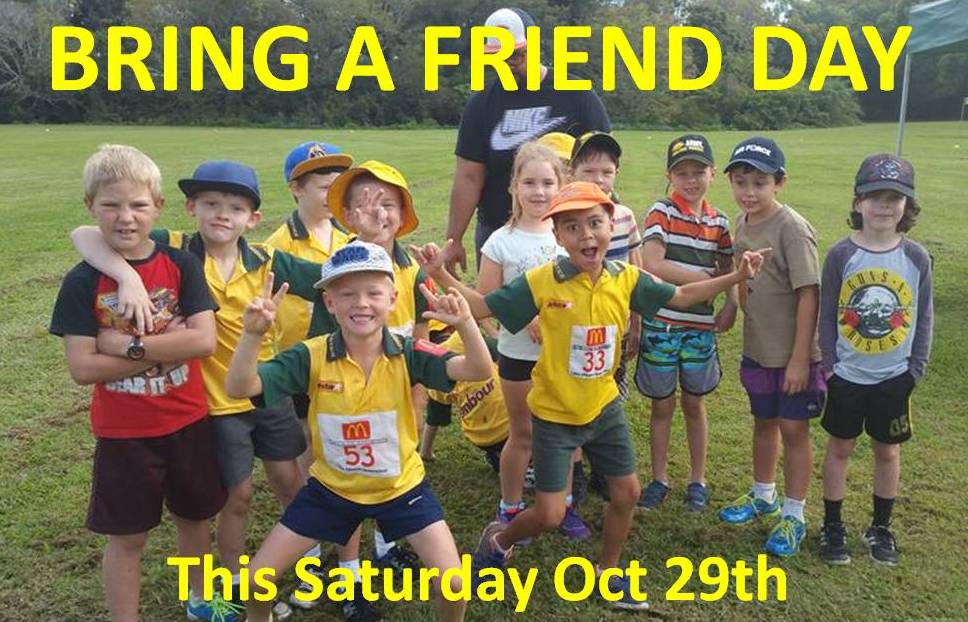 aturday Oct 29th is Bring A Friend Day. Invite one of your friends along to introduce them to Little Athletics and show them how much fun it is! For a gold coin donation we will welcome your friend, teach them the basics of running, jumping and throwing, and maybe even convince them to come back and join our great little club. Family, Fun, Fitness!